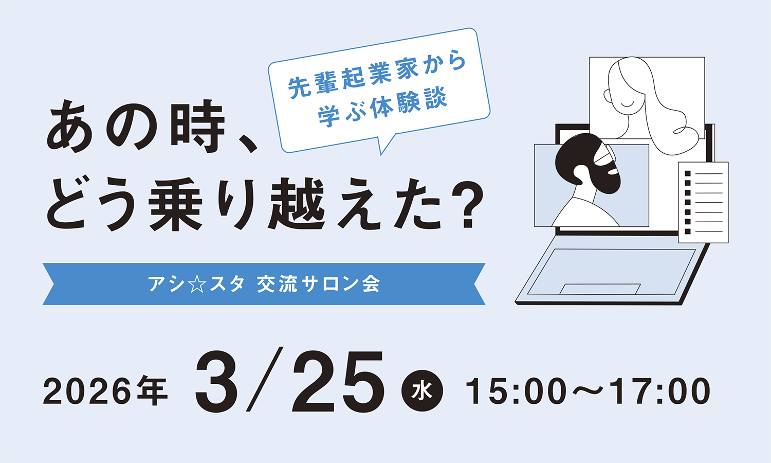 【3月25日開催】アシ☆スタ交流サロン会 ~あの時、どう乗り越えた? 先輩起業家から学ぶ体験談~