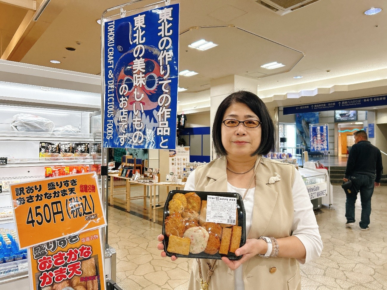 写真:店舗運営を行う塩釜港開発株式会社の鈴木由佳さん。ゲキ押し商品として、阿部善商店の「盛りすぎおさかなかま天」を紹介してくれました