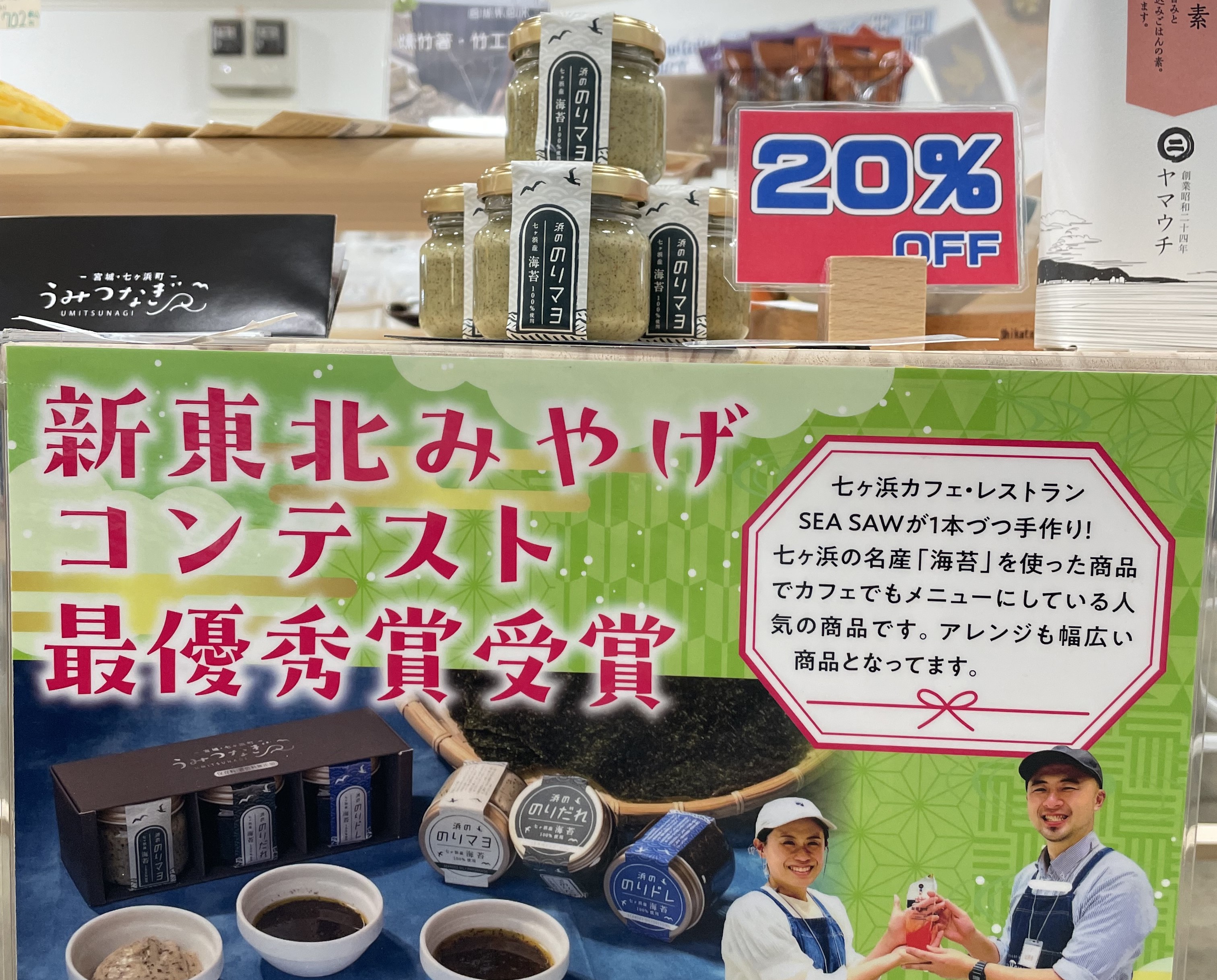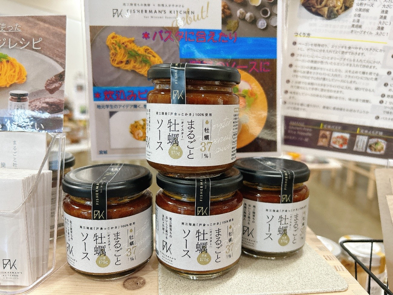 仙台市産業振興事業団で主催する「新東北みやげコンテスト」の受賞商品もさまざま並んでいます。2024年の最優秀賞を受賞したFISHERMAN’S KITCHENの「まるごと牡蠣ソース」や、2023年の最優秀賞fluirの「浜ののりだれ」などは、店頭でもとても売り上げがよいのだそう。