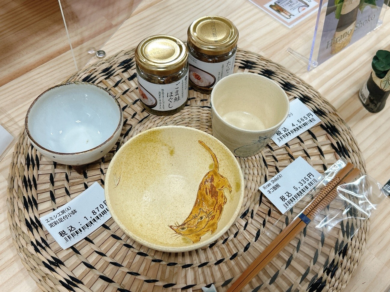 写真:新米がおいしい今の時期は、ご飯のおとももよく売れるそう。茶碗などと陳列し、食べ方のシーンも演出しています