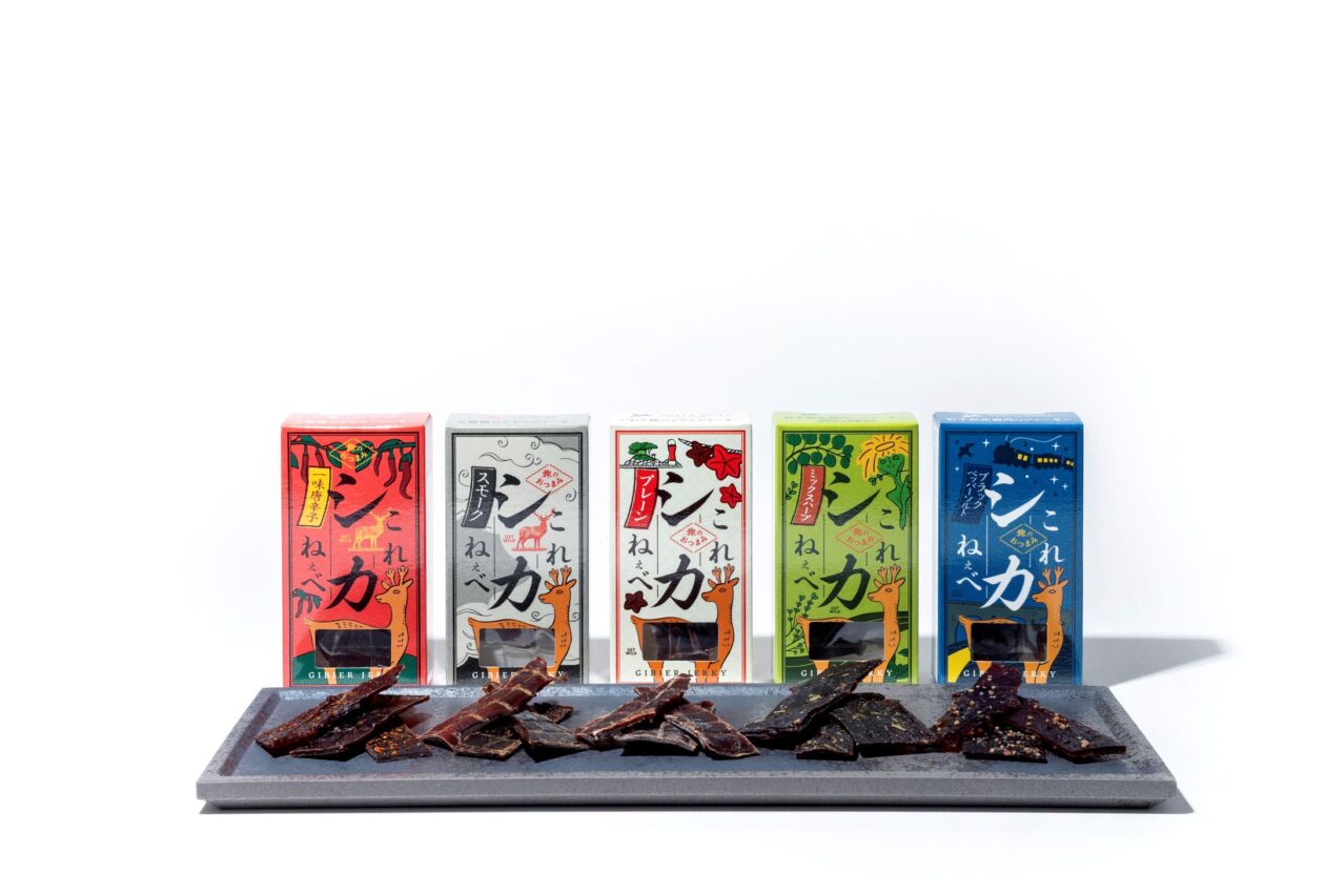 鹿肉ジャーキー「これシカねぇべ」は、目を引くパッケージとキャッチ―なネーミングがポイント。キャラメル箱サイズのポケットにも入る手軽感も魅力のひとつです。見た目だけではなく、味もこだわり、原材料は鹿肉のほか、食塩、砂糖、玉ねぎ、生姜、ローリエのみ。シンプルだからこそ引き立つ鹿肉のうま味が楽しめます。添加物を使わないジャーキーで、子どもにも安心して食べさせられる商品です。