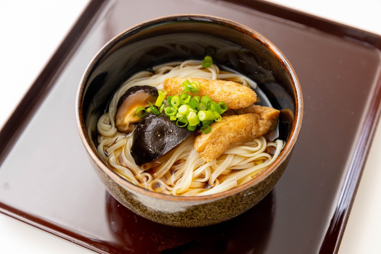 写真:小川さんが取材陣にふるまってくれた稲庭うどん。お揚げと椎茸を甘く煮た具材をトッピングしてくださいました。絶品!