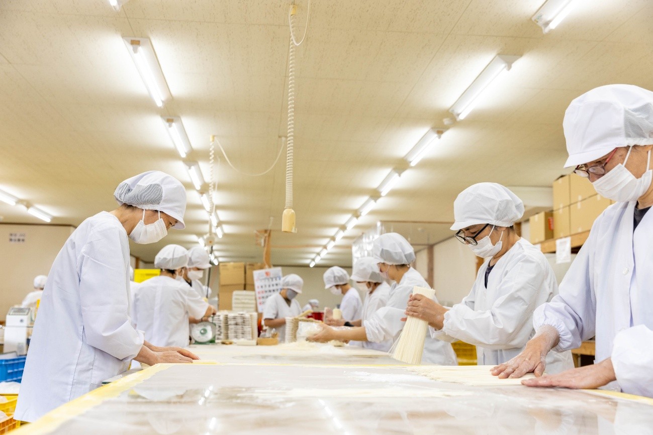 写真:丁寧な仕事は、稲庭うどんの仕込みだけでなく検品作業にも。スタッフのみなさんが手作業で行っています