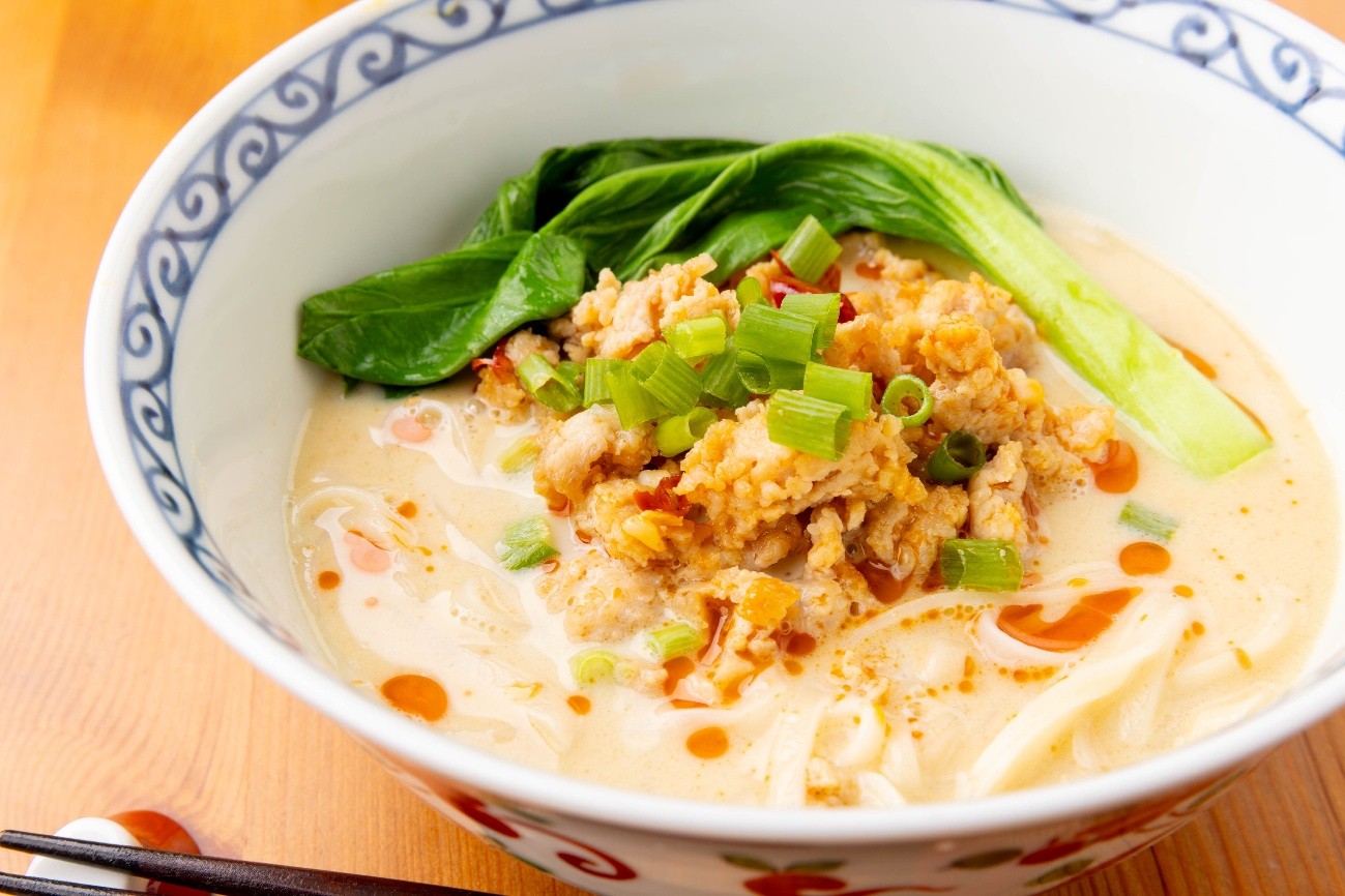 写真:付属のつゆを豆乳で割って、ごま油と豆板醤、鶏ガラスープで炒めたひき肉をトッピング。お店の「担々麺」にも負けない一品に!