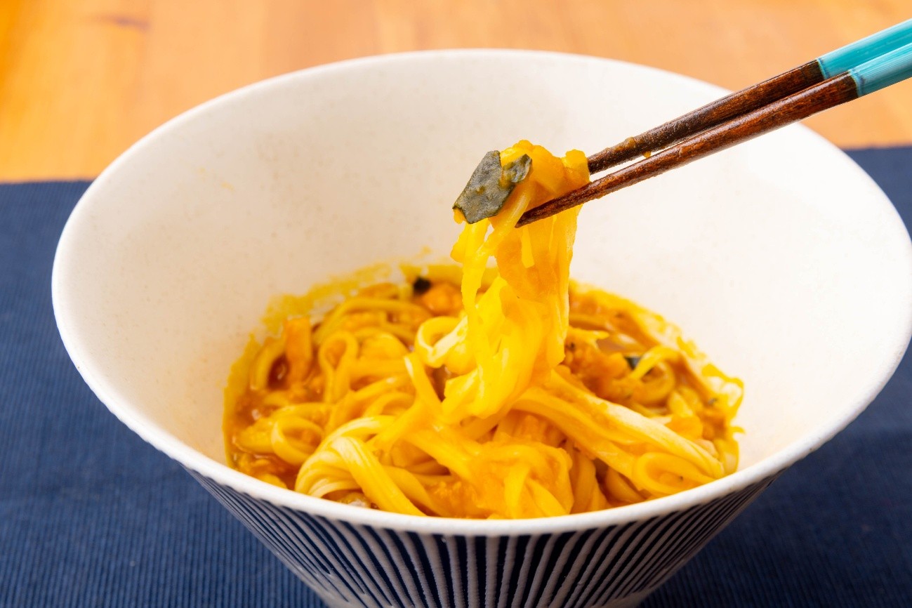 写真:電子レンジでやわらかくしたカボチャと合わせて「ほうとう風」に。優しい甘味が口いっぱいに広がります