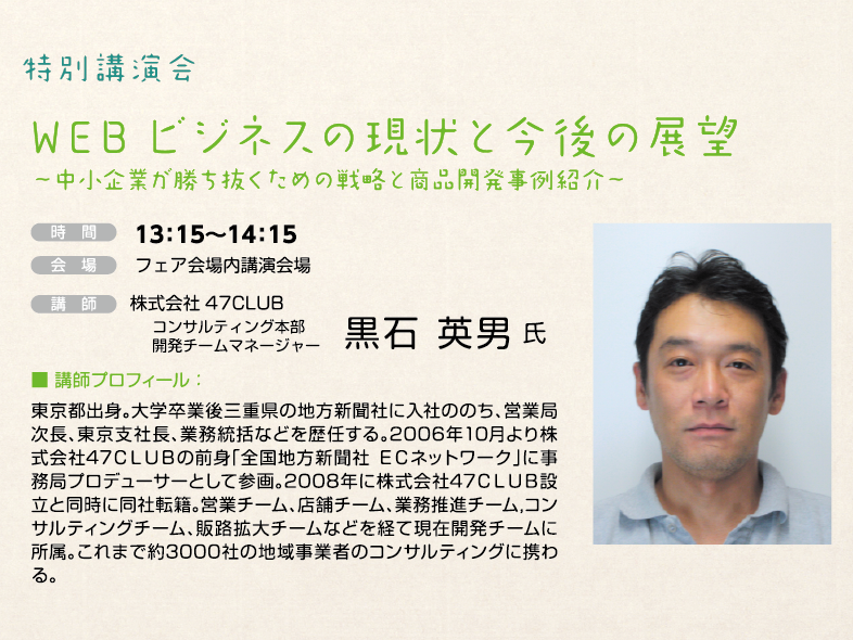 インターネットショッピングモール「47CLUB(よんななクラブ)」から見たWEB ビジネスの現状と今後の展望についてお話しいただくとともに、中小企業がこの先とるべき戦略について事例を交えてご説明いただきます。