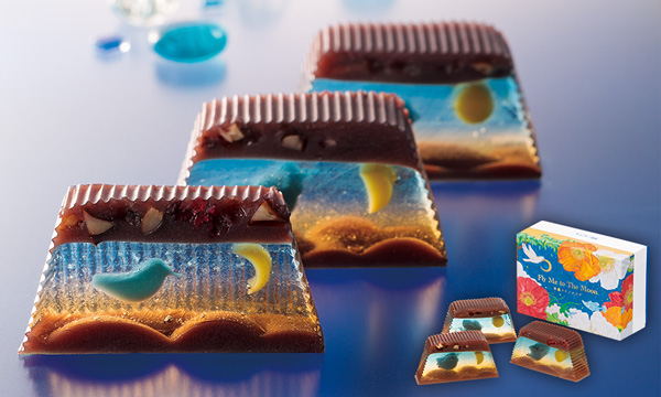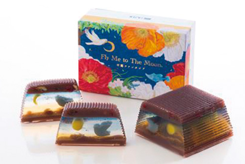 切るたびに断面の色や絵柄が徐々に変化し月が満ち、鳥が羽ばたいてゆく羊羹。皆で切り分けることで新たなコミュニケーションが生まれます。