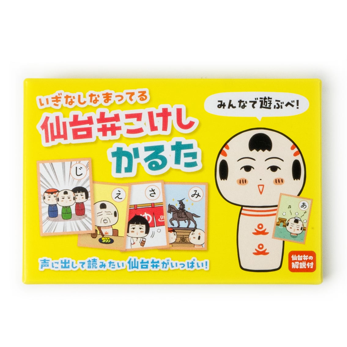 温かくユーモアあふれる「仙台弁こけしかるた」は、仙台弁を楽しく学べる商品です。 宮城の文化や仙台弁を「お土産」として持ち帰り、遊んでいただくことで、「宮城はいいな」「方言っていいな」と感じることができる商品です。仙台の企業が印刷・製造し、Made in宮城のかるたです。現在、仙台駅ビルでもお土産として発売しており、好評をいただいています。仙台弁こけしが読み札を読み上げる別売りの音声データもあります。