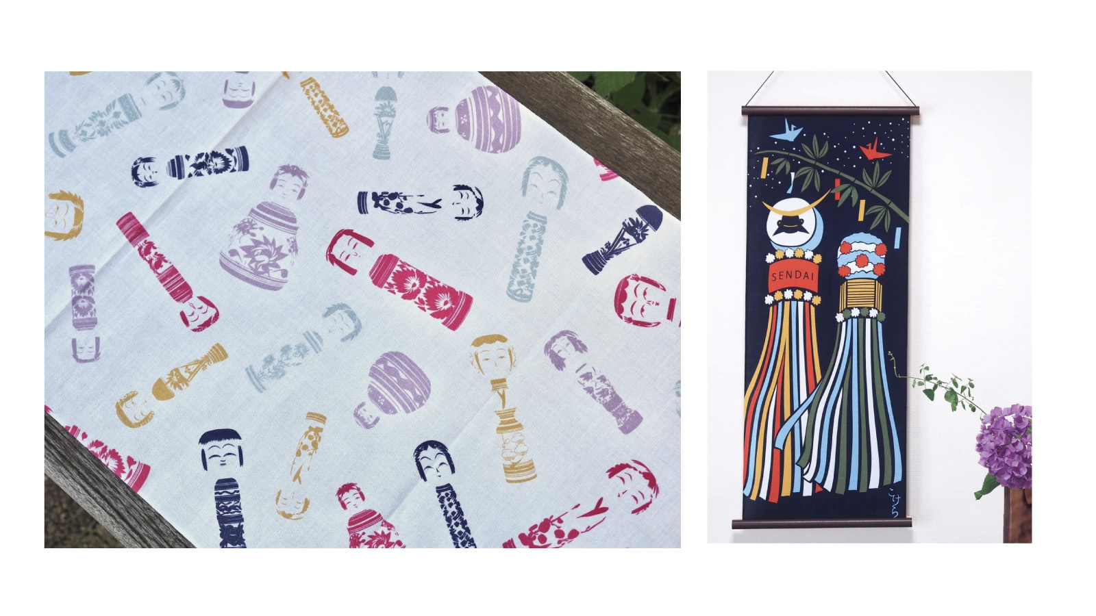 仙台や東北の文化を気軽に持ち帰ってほしいという想いから生まれた手ぬぐいです。「仙台七夕」は伝統的な色使いと大胆な構図で、日本一優美な星祭りを表現しました。「伝統こけし」は14名の工人の協力により、東北ならではの豊かな伝統デザインを散りばめました。5枚の型と京友禅型染めで丁寧に仕上げたこの手ぬぐいは、東北の文化と京都の技術が融合した作品です。日本語と英語の説明文も加え、国内外に東北の魅力を伝えます。